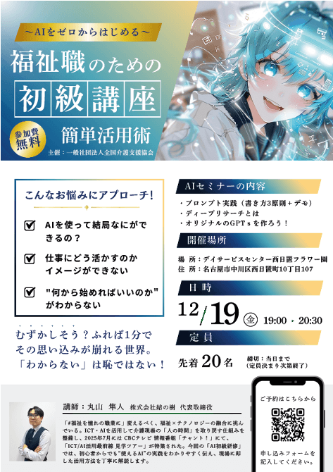 福祉業界に、変革の波が訪れています。2025年12月19日に開催された一般社団法人全国介護支援協会(弊社代表取締役吉田貴宏が代表理事を務める)主催の「福祉職のためのAI初級講座」は、満員御礼という形で、その関心の高さを証明しました。